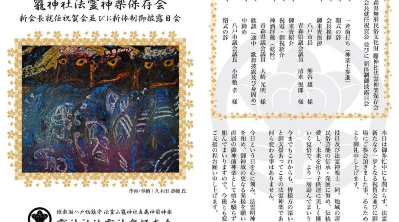 令和六年 龗神社法霊神楽保存会 活動報告【1月】️1日:歳旦祭/初詣参拝者身固め/新年奉納舞披露/イオン下田初売りイベント️2日:八食センター初売りイベント/はっちのお正月2025️3日:ピアドゥ新春イベント️8日:工藤板金工業新年安全祈願祭️8日〜3月2日:春祈祷️26日:田名部組新年会️29日:ノルウェー大使を迎える夕べ【2月】️4日:デイサービスみやぎ・ばんちょう・観音下慰問️9日:2024年世界ジュニアスピードスケート選手権大会オープニング️20日:丸吉 船舶竣工祝賀会【3月】️2日:八戸支援学校 謝恩会/春祈祷納め️3日:龗神社社家春祈祷【4月】️21日:新会長就任祝賀会並びに新体制御披露目会【5月】️5日:パークホテル婚礼️11日:法霊神楽祭前夜祭️12日:法霊神楽祭本祭️15日:御前神社例祭【6月】️8日:大興 創立30周年祝賀会️19日:八戸商工会議所女性会50周年 青森県連合会総会️27日:川口神社例祭【7月】️13日:東北連合三田会(慶應義塾大学卒業生の集い)️26日:八戸水道企業団 東北地区野球大会の集い️31日:JR東日本観光列車「ひなび」出発イベント並びに運行列車内神楽披露/八戸三社大祭龗神社前夜祭祭典参列️31日〜8月3日:八戸三社大祭門付【8月】️1日:郷内半巡発御祭祭典参列/八戸三社大祭出発式/郷内半巡発御祭(八戸三社大祭お通り)️2日:八戸三社大祭龗神社中日例祭参列/あい愛デイケアおっとも慰問️3日:郷内半巡還御祭(八戸三社大祭お還り)/動座祭(八戸三社大祭)/郷内半巡還御祭祭典参列️10日:御前神社 夏祭【9月】️2日:八戸三社大祭龗神社例祭(大祭式)参列️5日:諏訪神社(南部町) 例祭️8日:小田八幡宮 例祭️14日:四本松神社 例祭️15日:類家シニアガーデン慰問️16日:正一位白山宮(沢里) 例祭/デイケアサンライズ慰問️21日:赤倉山神社(弘前市) 例祭️29日:あおもり10市大祭典 in 黒石【10月】️2日:八戸市議会 祝賀会️6日:城下附祭 50周年祝賀会️12日:十一日町龍組 最優秀賞県知事賞受賞祝賀会️13日:長苗代シニアガーデン慰問️17日:岩本電機 階上工場竣工祝賀会️23日:文明シャッター 創立60周年祝賀会️26日:三八五交通安全の集い【11月】️9日:柏崎地区社会福祉協議会祭り️16日:法霊神楽年越祭️25日:八戸小学校 神楽鑑賞会️30日:第47回 民俗芸能の夕べ-———【法霊神楽公開練習見学体験会開催報告】3/15、3/284/12、4/255/15、5/306/7、6/15、6/237/4、7/10、7/21、7/2610/18、10/3011/10、11/2212/13-———令和六年も個人法人団体問わず、活動を通じて多くの皆様にお会いでき、法霊神楽を御披露する事ができました。また新体制の御披露目並びに橋本昭一新会長就任祝賀会を、市長始め議員の皆様、地域の皆様に参会頂き滞り無く開催できました事は、私共としまして大きな喜びでありました。今後も伝承に努め、技芸の向上に邁進してまいりますので、来年もどうぞ宜しくお願い申し上げます。#神社 #神社仏閣 #青森県の神社 #八戸市の神社 #八戸の神社 #青森県 #八戸市 #青森県八戸市 #八戸 #総鎮守 #八戸総鎮守 #龗神社 #法霊山 #法霊山龗神社 #おがみ神社 #神楽 #法霊神楽 #南部神楽 #南部山伏神楽 #伝統芸能 #民俗芸能 #青森県無形民俗文化財 #活動報告