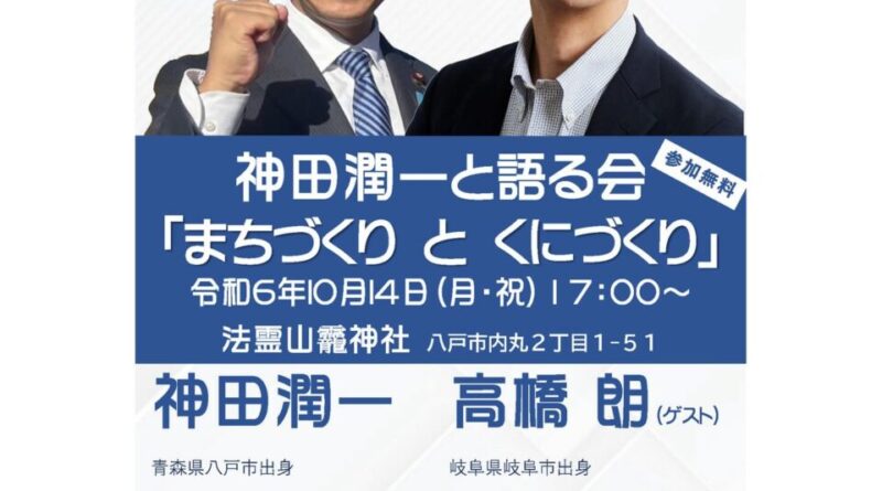 明日17時より、衆議院議員総選挙立候補予定者である「神田潤一」さんとまちづくりについて語る会が行われます。会場は法霊山龗神社の直会殿、事前申込は不要で参加費は無料となります。多くの皆様のご参加をお待ちしております。#神社 #神社仏閣 #青森県の神社 #八戸市の神社 #八戸の神社 #青森県 #八戸市 #青森県八戸市 #八戸 #総鎮守 #八戸総鎮守 #龗神社 #法霊山 #法霊山龗神社 #おがみ神社 #神田潤一 #神田潤一議員 #衆議院議員 #衆議院議員選挙 #衆議院議員総選挙 #衆議院議員総選挙2024 #衆議院議員選挙2024 #自民党 #自由民主党 #自民党青森 #青森2区 #青森2区