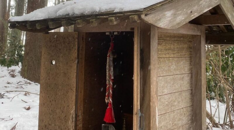 現地に行ってみると、小さなお社が崖の上に鎮座しており、崖下には飲めば長寿になると昔から伝わる小川が流れていましたが、雪ではっきり確認できませんでした。