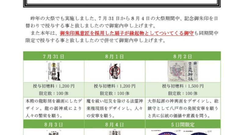 令和6年八戸三社大祭関連プレスリリース公開情報①大祭期間中限定御朱印②東北フリーブレイズ行列奉仕本日法霊山龗神社では、八戸三社大祭に関連するプレスリリースを2件公開いたしました。八戸市広報統計課にも依頼致しましたが、月曜日の扱いとなる予定です。①大祭期間中限定御朱印に関して昨年同様、本年も大祭期間中に日替わりの御朱印を授与する事と致しました。️7月31日:龗神社本殿彫刻の龍画入御朱印民間伝承で水の神、財の神とされる龍の御神威を戴き、授与された者の繁栄を願う御朱印。・授与予定数:限定100体・授与初穂料:1,200円/体️8月1日:法霊神楽一斉歯打ち御朱印魔を祓い厄災を除けると伝わる権現頭の歯打ちにより、授与された者の安寧を願う。・授与予定数:限定100体・授与初穂料:1,200円/体️8月2日:龗神社御神輿画金和紙御朱印大祭が三神社になる前の龗神社単独祭礼だった時代より存在している御神輿を金和紙に描き、八戸市の総鎮守として八戸の発展安寧を願うと共にその歴史を顧みる機会とし、伝統の価値や意義を授与された者に問う。・授与予定数:限定100体・授与初穂料:1,500円/体️8月3日:八日町奉納笠鉾御朱印行列の祭具や所役を紹介する事により、授与された者が神事への理解を深めるきっかけとなる事を願う。・授与予定数:限定100体・授与初穂料:1,200円/体️8月4日:龗神社先頭山車御朱印その年の附祭の中で、特に山車組の先頭となる組の山車をデザインした御朱印。十一の山車組が順に先頭となる事から、同じ山車組が登場するのは11年に一度となる。山車も芸能団体も附祭であり、神社行列と別にあるのではなく、神社行列の一部である事を広く知ってもらうきっかけとなる事を願う。・授与予定数:限定100体・授与初穂料:1,200円/体️5日間:御朱印風デザイン縁起物扇子付御守りメインとなる御守りを扇子に取り付ける事で、その風は神風となり身を包み、授与された者に恩頼を齎す。表面は御朱印デザイン、裏面には全ての附祭団体の名が入り、特に山車組に関しては今年の題材名も入っている。・授与予定数:限定350体・授与初穂料:2,500円/体②東北フリーブレイズ行列奉仕本年八戸三社大祭8月3日の郷内半巡還御祭に於いて、八戸市にフランチャイズを置くプロアイスホッケーチーム「東北フリーブレイズ」さんが行列に奉仕してくださる事になりました。企業団体様の御奉仕ではなく、スポーツチームの御奉仕は当社として初めての試みとなります。以上、どうか多くの報道関係者の皆様に取材頂きたく、宜しくお願い申し上げます。#神社 #神社仏閣 #龗神社 #法霊山 #法霊山龗神社 #青森県の神社 #八戸市の神社 #八戸の神社 #総鎮守 #八戸総鎮守 #八戸 #八戸市 #青森県 #八戸三社大祭 #八戸三社大祭龗神社発祥三百年 #八戸三社大祭2024 #三社大祭 #三社大祭龗神社発祥三百年 #三社大祭2024 #東北フリーブレイズ #御朱印 #限定御朱印 #期間限定御朱印