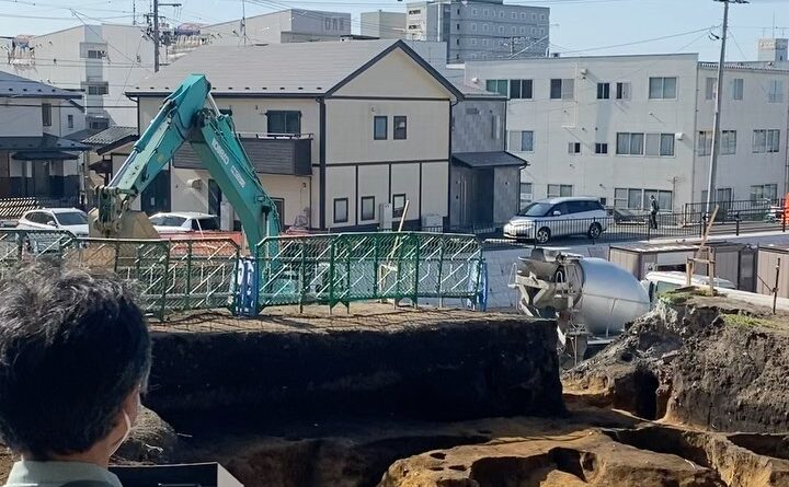 埋蔵文化財調査の撮影の為、是川縄文館の方でドローン撮影を行っていました。4枚目の深い溝が、以前書いた縄文期の落とし穴「Tピット」というものだそうです。ただ、他で出土したものよりも深さがあるという印象なのだそうです。5枚目の浅く長い溝は、集落を分割するラインの可能性が高いそうで、多分平安初期という事です。この時代では集落同士の諍いや争いもあり、この様なラインで集落単位を分けていた為、その可能性が高いらしいです。現在西側では近代的な道路建設工事、東側では縄文や平安の遺跡発掘というアンバランスな状況となっています(写真7)。ちなみに写真に背中が写っている女性は、地元紙東奥日報の、美しすぎる新聞記者で有名かもしれないCさんです。今年の八戸三社大祭の状況をスパイしに来ていたところ、偶然ドローン撮影のタイミングにあたり、そのまま埋蔵文化財の取材もされていきました。そして写真8ですが、何なのか不明な遺構です。是川縄文館の学芸員さんも、現状では答えられないと言われました。時代は縄文以前と推定されます。その理由ですが、元々あった人工的な溝か穴の様な部分に土が堆積した跡があり、その堆積した所にTピットが掘られている跡があるという理由です。下にいくほど時代が古いわけですので、最初に人工的な溝か穴が掘られ、そこに時代が進んで土が堆積し、さらに時代が進んでその上に縄文時代にTピットが作られた、という流れになります。つまり最初の溝又は穴は、縄文より古い、という事が推測されます。これが何か判明したらまた書きたいと思います。また写真3の穴ですが、掘立柱の跡と見られるという事なのですが、全部ではないみたいですが、これは江戸時代の可能性が高いのだとか。理由は、柱の間隔が江戸時代の建築の特徴的な様式に当てはまる、という事なんだそうで、良くわかるなぁと感心していました。ちなみに、縄文時代と平安時代はわかるのですが、その間の時代のものは出てきていません。また、集落跡が複数出ているにも関わらず、土師器などの出土が極端に少ないそうで、これも謎です。この辺りも含め色々わかったらまた書かせていただきたいと思います。#神社 #法霊山 #法霊山龗神社 #青森県の神社 #八戸市の神社 #八戸の神社 #shrine #shinto #shintoshrine #shintoism #埋蔵文化財 #埋蔵文化財発掘調査 #埋蔵文化財発掘調査中 #埋蔵文化財調査中 #縄文時代 #縄文時代の遺跡 #平安時代の遺跡 #是川縄文館 #八戸市教育委員会 #ドローン撮影 #東奥日報 #八戸三社大祭 #八戸三社大祭龗神社発祥三百年 #八戸三社大祭2021 #三社大祭 #三社大祭龗神社発祥三百年 #三社大祭2021