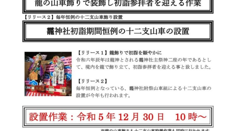 【プレスリリース】①初詣期間中境内を龍飾りで賑やかに②毎年恒例の十二支山車設置作業本日、プレスリリースを配信致しました。来年は辰年。龗神社主祭神二座は龍神と伝えられていますので、龗神社の11山車組に頼み、境内を龍飾りで賑やかにしていただく事になりました。11山車組それぞれが、思い思いの装飾を持ち寄って、独自の感性で様々な場所に設置していく予定になっています。辰年の最初は龗神社御祭神を象徴する龍飾りに迎えられながらの初詣で、御神徳も益々に参拝される皆様にとって佳き年となられます様、山車組の方々に技を奮ってもらいたいと思います。そしてもう一つ。毎年恒例となっている、その年の十二支をテーマにした山車が、今年も奉納展示される事となりました。テーマはもちろん辰年ですので、こちらも龍がメインになるのではないかと思います。担当山車組は「朔日町附祭」。この十二支山車は龗神社附祭山車組の当番制になっており、今年の朔日町は2回目の担当になります。去年で11山車組全てが一度担当した事になり、今回から2巡目になりました。十二支山車設置作業も、龍飾りの作業も、同じく12月30日の午前10時から開始します。報道関係の皆様も見学に来たい方も、ぜひお待ちしておりますのでお気軽にご来社ください。#神社 #神社仏閣 #龗神社 #法霊山 #法霊山龗神社 #青森県の神社 #八戸市の神社 #八戸の神社 #総鎮守 #八戸総鎮守 #八戸 #八戸市 #青森県 #八戸三社大祭 #八戸三社大祭龗神社発祥三百年 #八戸三社大祭2023 #三社大祭 #三社大祭龗神社発祥三百年 #三社大祭2023 #初詣 #初詣2024 #2024年初詣 #十二支飾り #龍神 #高龗神 #法霊大明神