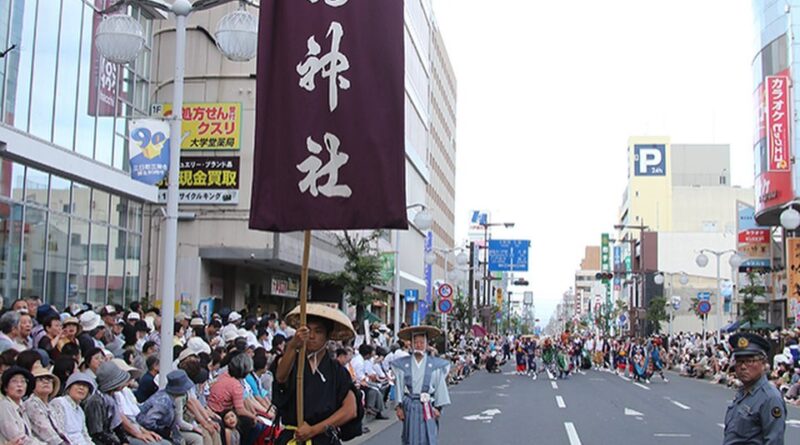 八戸三社大祭の法霊山龗神社神輿渡御行列は、先頭旗から始まります。二対の社号を冠した紫色の旗が左右横並びになり、龗神社行列の最も先頭を歩きます。