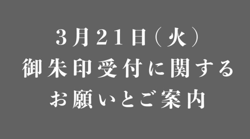続きを読む標題の件に関しましてお知らせ致します。 21日は、神葬祭並びに御祈祷予約の関係で、御朱印の対応が可能な時間に限りがあります。 また御祈祷の受付に関しましては、直接来社頂いての受付では待ち時間が発生する場合があります。 御