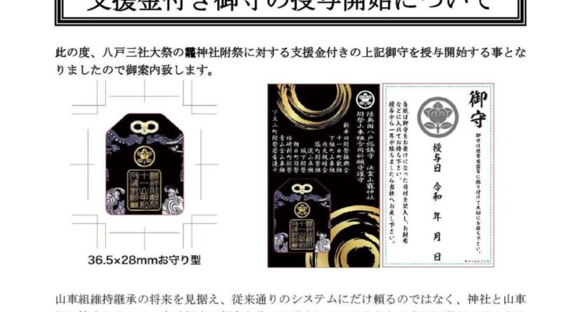 続きを読む崇敬者・報道関係者 各位 此の度龗神社では、八戸三社大祭で龗神社に供奉する十一の山車組に対する支援金付きの御守を授与開始する事と致しましたので御案内申し上げます。 昨今厳しい環境に置かれている山車組の維持継承に対して、神
