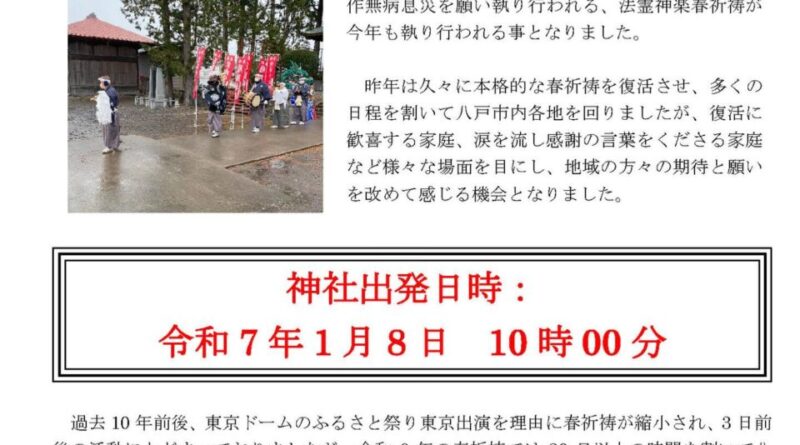 続きを読むプレスリリース公開情報(法霊神楽関連)明日1月8日より、令和7年の法霊神楽による春祈祷が始まりますので御案内致します。八戸市庁の広報統計課には昨日中に依頼しましたので、報道関係各位に於かれてはお手元に届いているものと思い